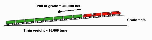 (15,000 tons) x (20 lbs per ton) x (1.5 grade) = 450,000 lbs We still have only 12,000 hp available. Since HP equals pull times speed, if the pull goes up then the speed must come down. The train speed will drop to 10 mph, the point where the product of the new 450,000 pounds pull and the speed divided by 550 (HP definition) equals the available HP. But we are in real serious trouble here folks. Our four 4 axle locos can only deliver 336,000 lbs of pull because of their 1.12 million lbs of weight on drivers and the 30% adhesion factor. So our locos are going to slip and stall on the hill. Although we have enough Hp to pull this train up the 1.5% grade at 10 mph we do not have enough traction to do so. And, again, you had better set the train air brakes as you stall or the train will drag you back down the hill.