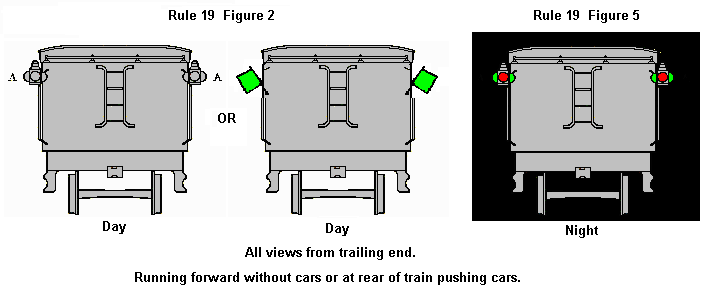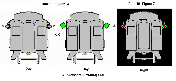 The above diagram depicts the rear end of a passenger train, but the Markers would be the same if it were a caboose or the last freight car of a cabooseless train.The diagram below shows how the Markers would be applied in exactly the same manner to the steam locomotive tender if that loco was running without any cars or if that loco was pushing on the rear of a train.
