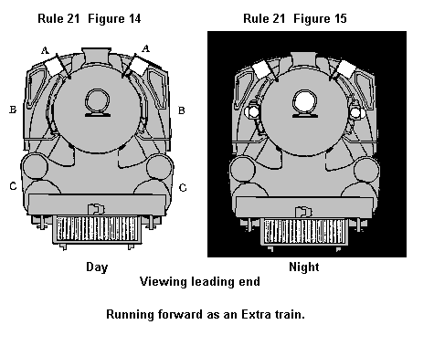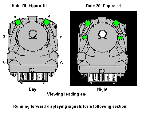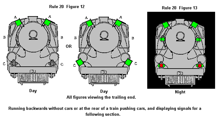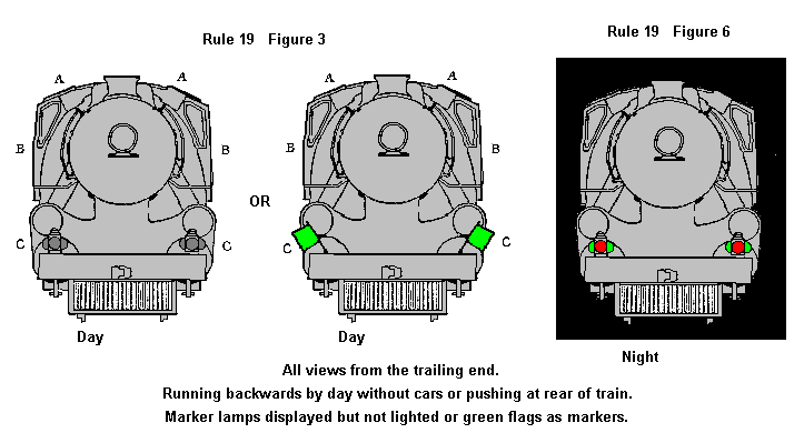 When the rear of a train is equipped with built-in electric markers they must be lighted by day and by night. The requirement that markers display green to the front and to the sides will not apply.Obviously this is a nod towards the now ubiqitous diesel-electric locomotives. Similarly Rule 20 and Rule 21 were modified to eliminate the green and white flags, acknowledging the brighter lights of the period.Rule 20. All sections except the last must display two green lights by day and by night on the front of the engine.Rule 22 requiring that all engines on a train display the proper signals for that train remained in effect. But the definition of an "Engine" was changed to read:Rule 21. Extra trains must display two white lights by day and by night on the front of the engine.